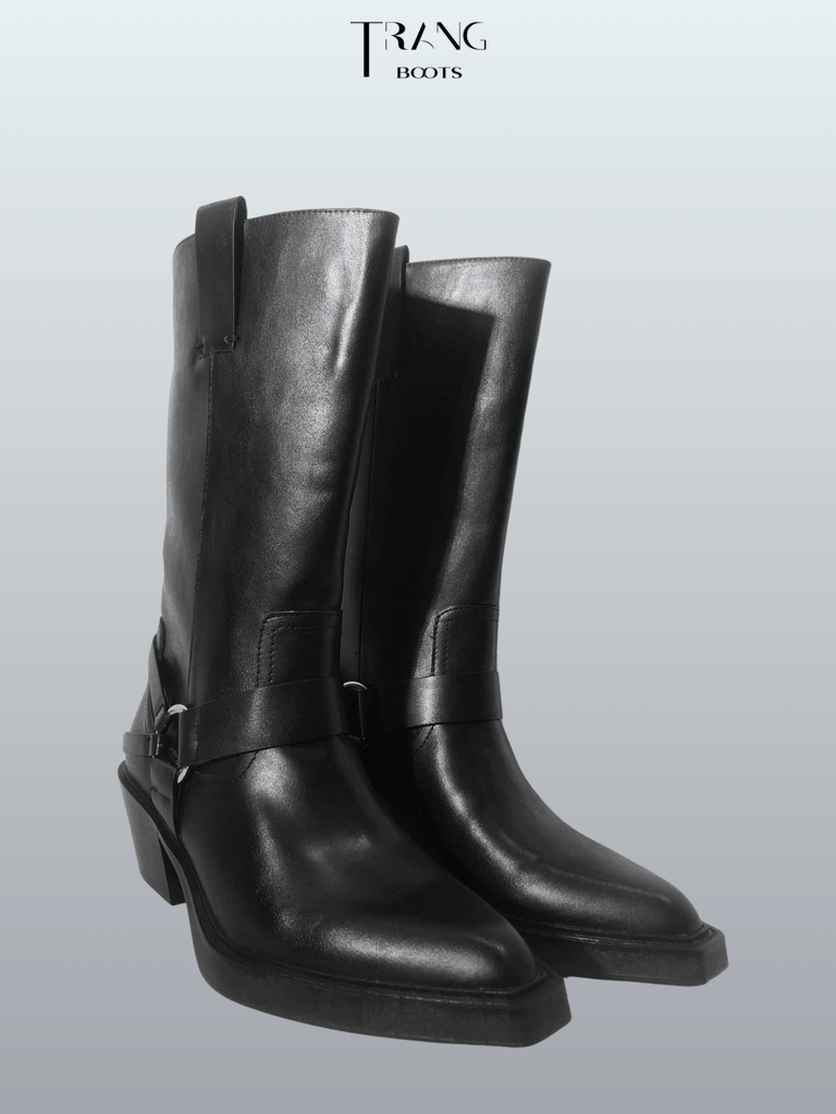 Boots lửng cưỡi ngựa (thường gọi là riding boots hoặc equestrian boots) là biểu tượng của sự thanh lịch và phong cách cổ điển. Đặc trưng bởi chiều cao đến giua bắp chân , phần thân ống đứng cứng cáp và mũi tròn hoặc hơi nhọn, những đôi boots này mang lại vẻ ngoài tinh tế và sang trọng. Ban đầu được thiết kế cho mục đích cưỡi ngựa, giờ đây chúng trở thành lựa chọn lý tưởng để tôn lên vẻ đẹp của những chiếc váy len, quần skinny jeans hay quần legging, tạo nên một phong cách vừa mạnh mẽ vừa duyên dáng.