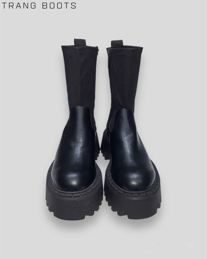 Boots cổ thấp ống thun co giãn ôm chân có khóa cạnh giúp bạn dễ mang chúng, đế cao su bằng có răng cưa giúp chống trơn trượt, gam màu đen cơ bản phù hợp mọi outfit.