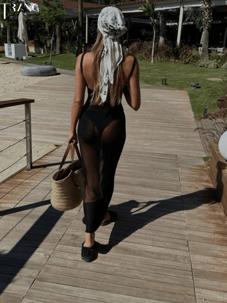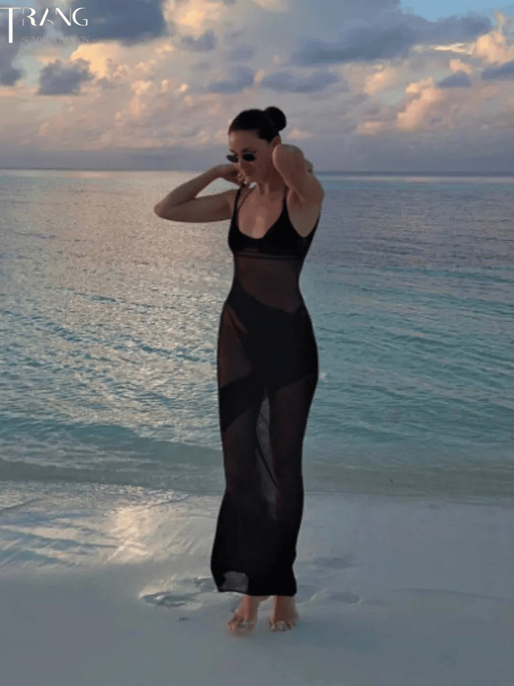 Đầm ôm dáng dài hai dây hở lưng quyến rũ, chất lưới mang đến phong cách mùa hè, đi biển Size: S M L