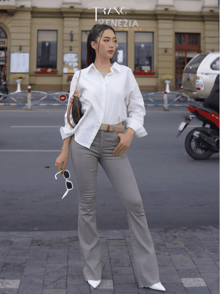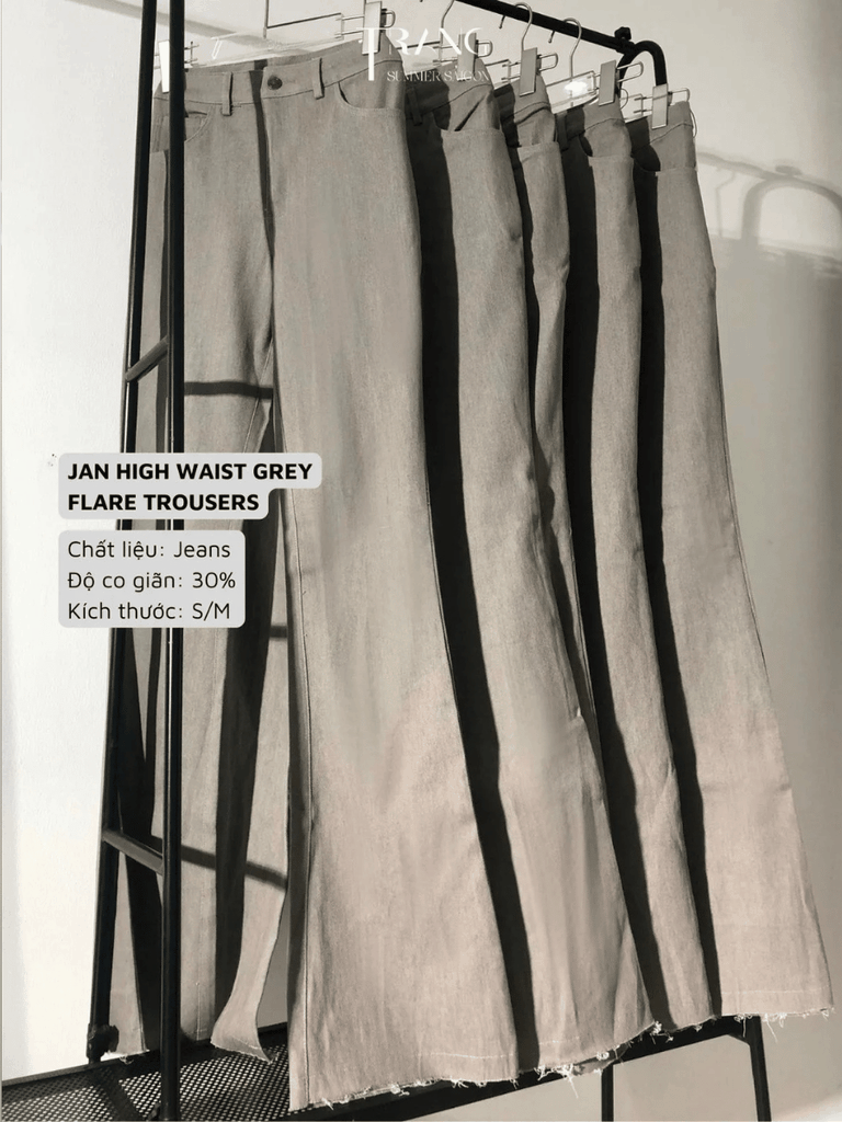 JAN HIGH WAIST GREY FLARE TROUSERS - QUẦN JEANS JAN XÁM ỐNG LOE LƯNG CAO CO GIÃN Chất liệu: Jeans Độ co giãn: 30% Size: S/M S: <55kg Eo: <65cm/ Mông: <95cm Ống loe: 25cm/ Chiều dài quần: 108cm M: >55kg Eo: 65-70cm/ Mông: 95-100cm Ống loe: 27cm/ Chiều...