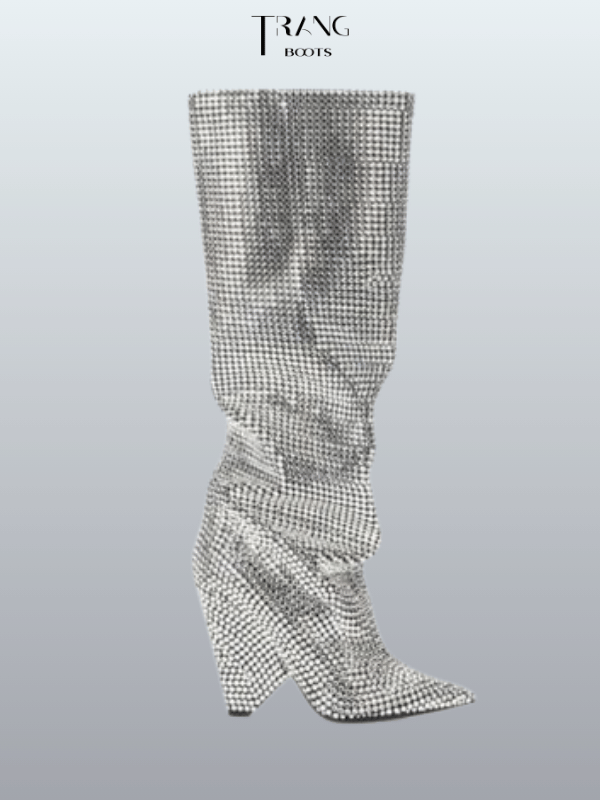 Knee Boots bạc đính đá lấp lánh, thời trang, gót trụ khối.