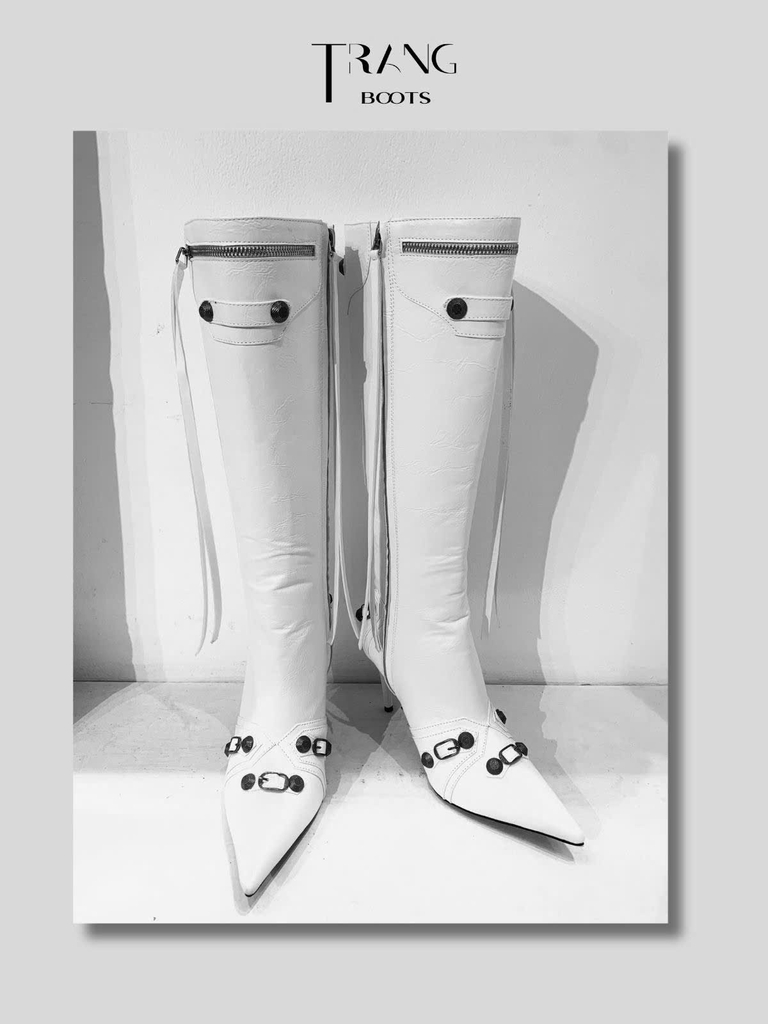 Boots gối mũi nhọn gót nhọn với thiết kế đầy cá tính dọc thân boots.