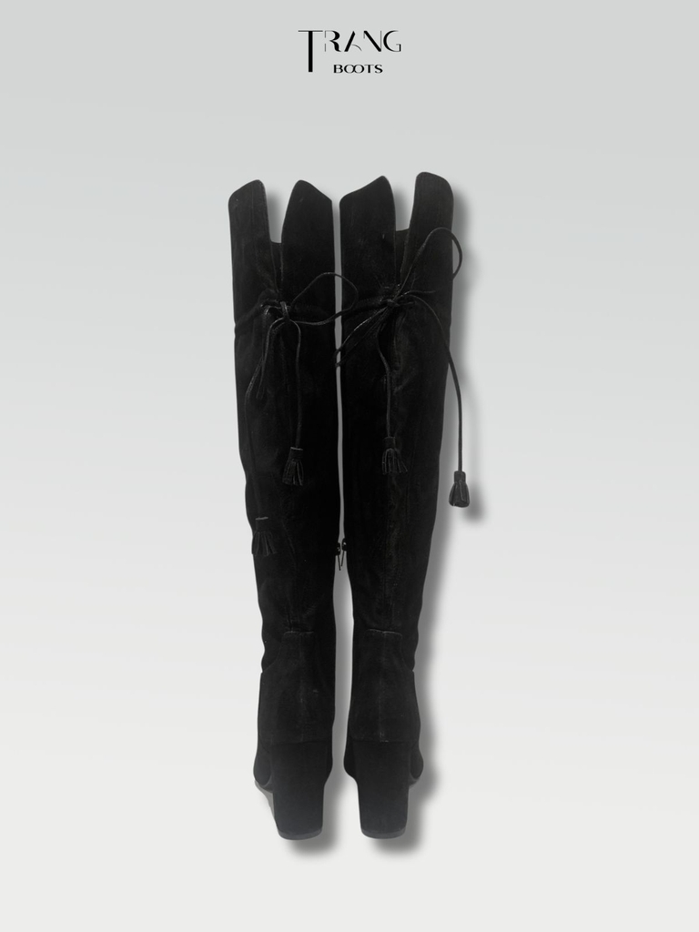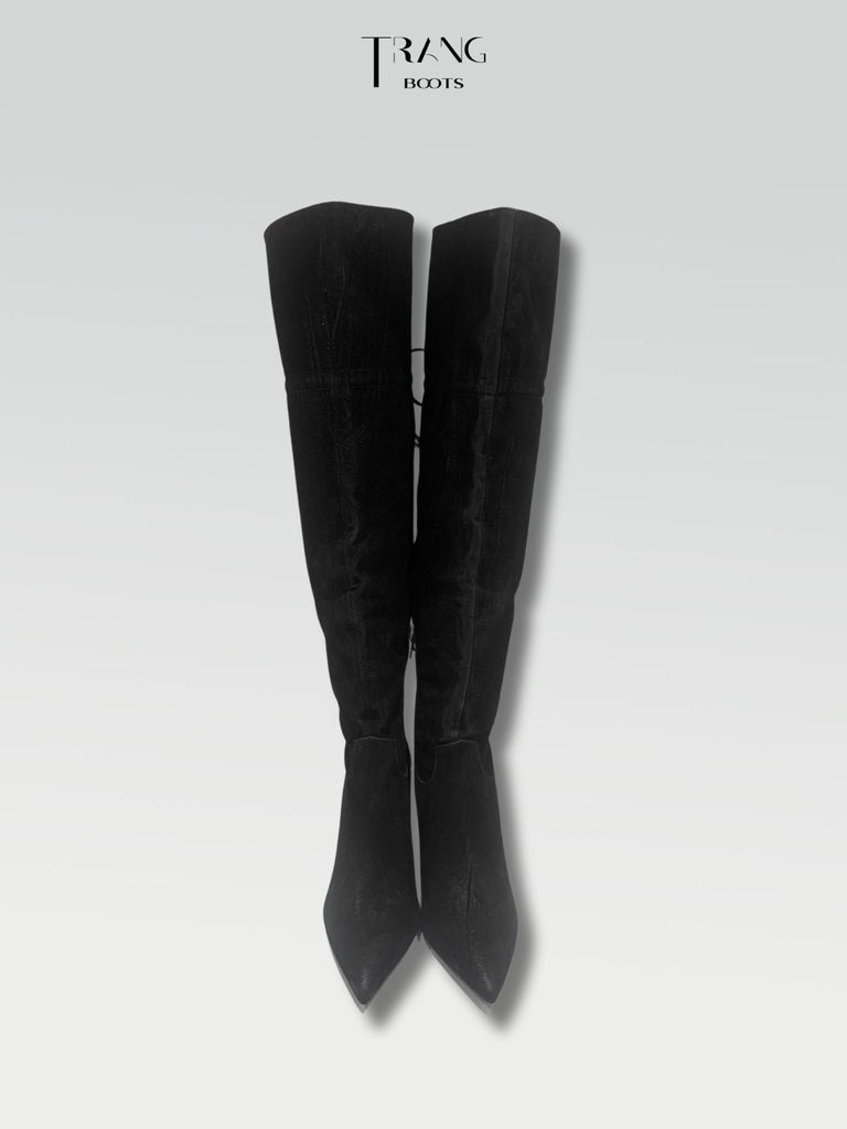 OVER KNEE BOOTS SUEDE BLACK - OVER KNEE BOOTS MŨI NHỌN DA LỘN ĐẾ TRỤ PHỐI DÂY CỘT