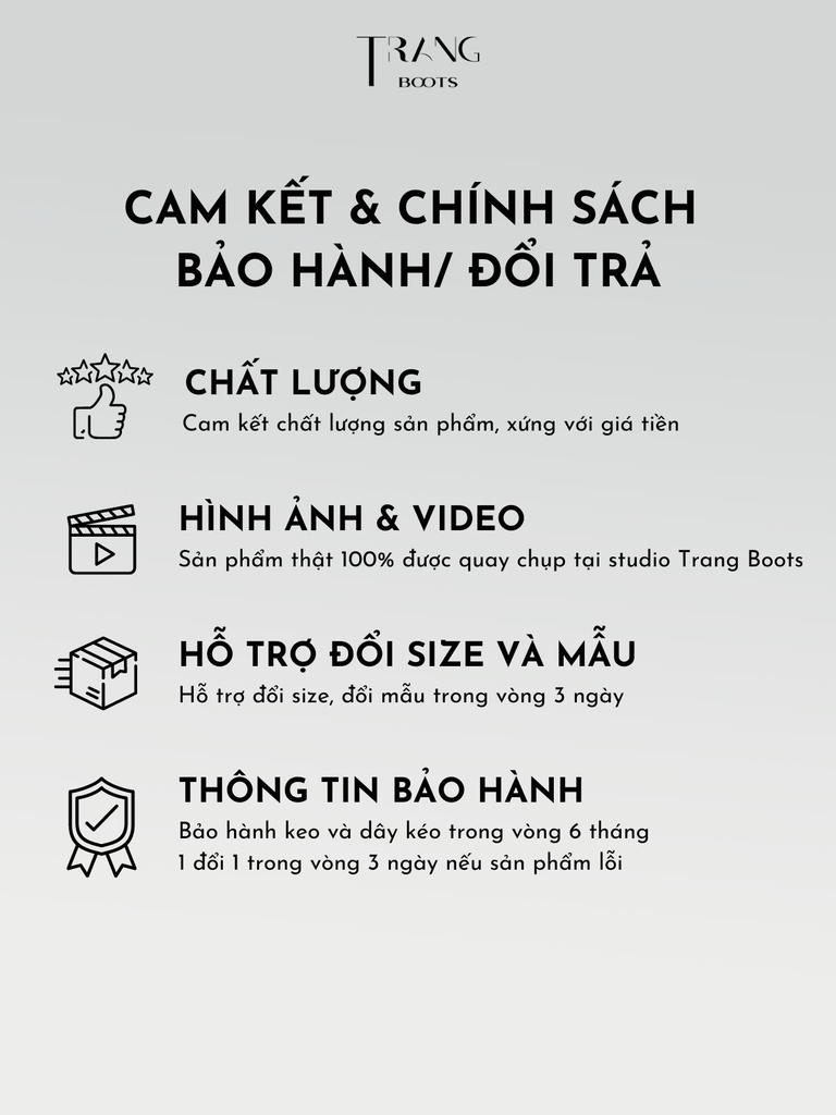 - Nếu hết thời gian bảo hành, khách có thể liên hệ Trang Boots. Chi phí sẽ được tính tuỳ vào mức độ hư hỏng của sản phẩm.