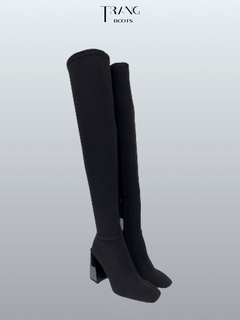 Boots dài qua gối , mũi vuông, có khóa kéo bên trong, gót tráng gương sang chảnh, dáng gót trụ to chắc chân.