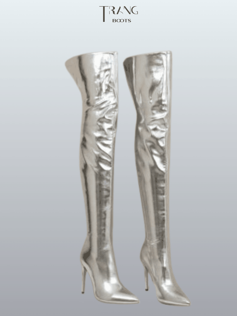 Giày boots cao qua gối với lớp phủ màu bạc kim loại nổi bật.