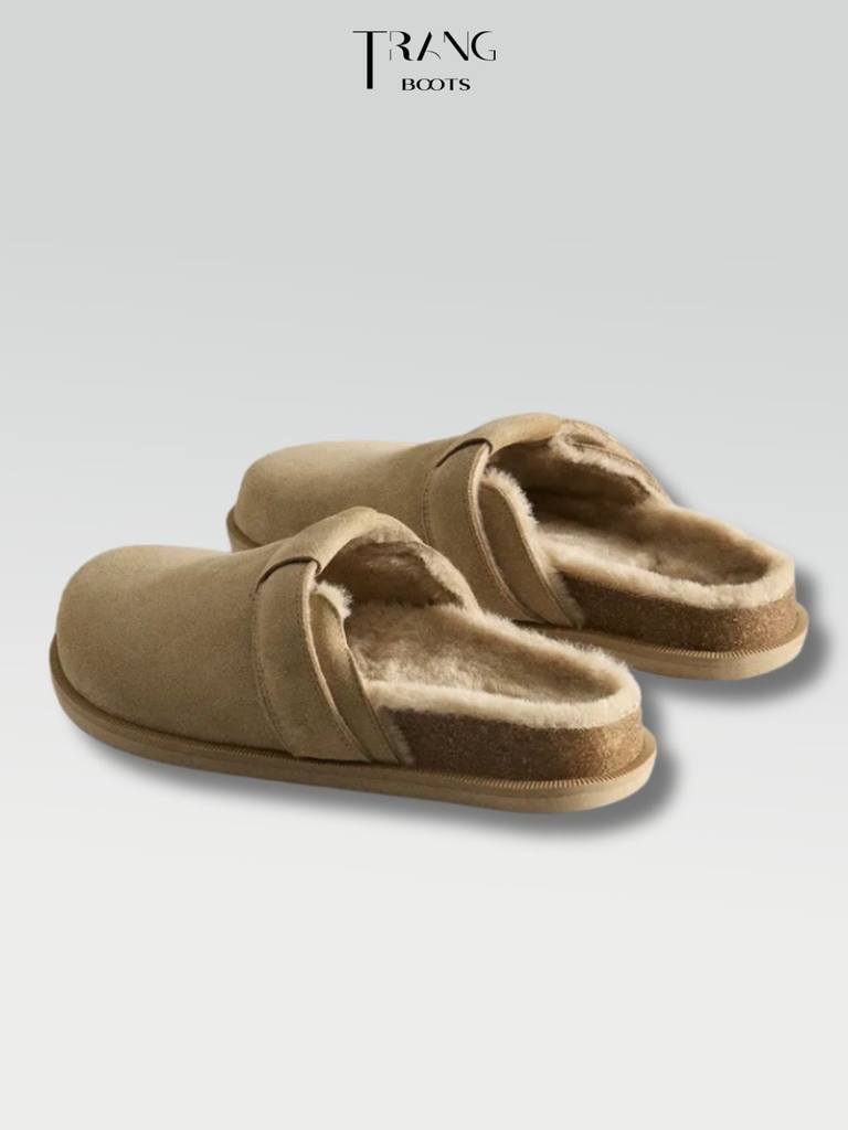 Giày đế bằng có chi tiết quai ở mu bàn chân và đế lót bằng lông nhân tạo.